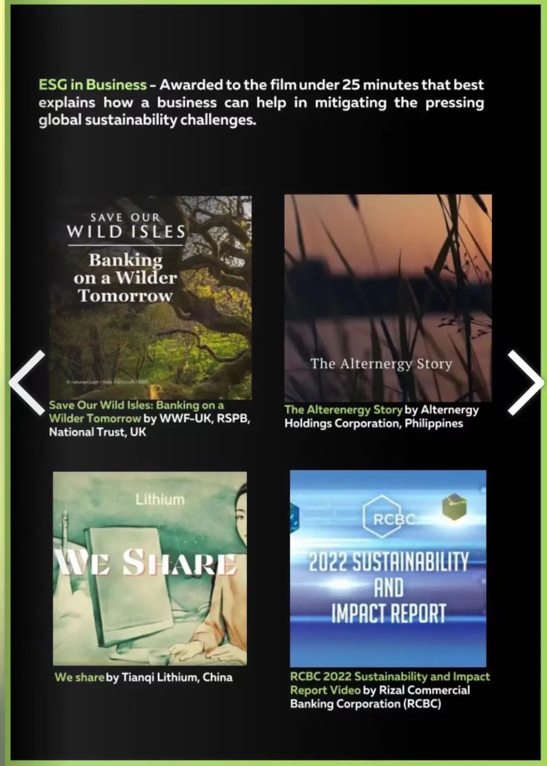 ? ? ? 英国外地时间11月6日,,,,,,,,第11届TVE全球可一连生长影戏奖(Global Sustainability Film Awards, GSFA)在伦敦揭晓,,,,,,,,非凡国际(以下简称“非凡国际锂业”)原创沙画作品We Share荣获ESG IN BUSINESS SHORT FILM AWARD奖项,,,,,,,,成为全球首家获得该奖项的中国企业。。。。。。